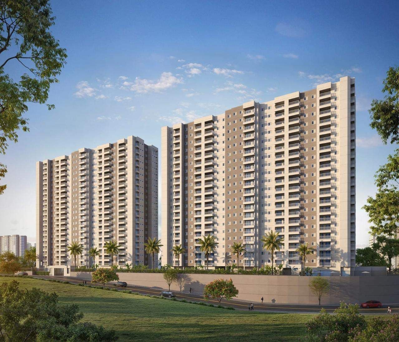 Condomínio fechado com apartamentos de 60m² a 75m², opções de 2 ou 3 dormitórios com suíte, 1 ou 2 vagas de garagem, e estrutura de lazer completa estilo clube.